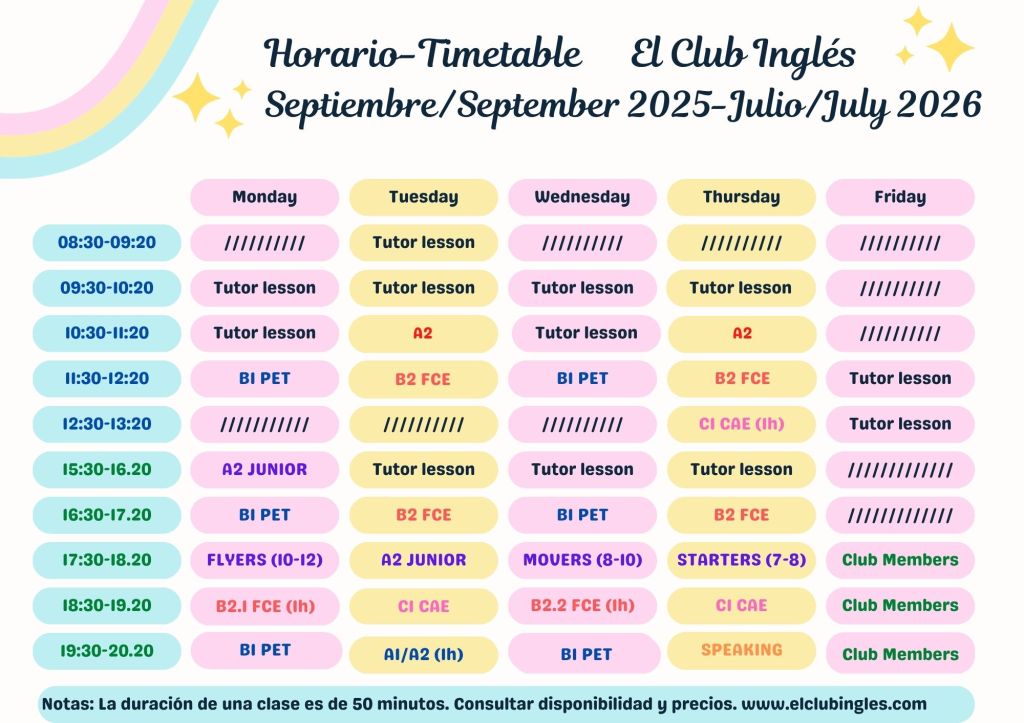 El curso académico comienza el 1 de septiembre 2025 y dura hasta 31 de julio 2026. Son 10 meses intensivos de aprendizaje, con preparación por niveles en grupos de una o dos horas a la semana, para los niveles juveniles y adultos en A1, A2, B1, B2 y C1, repaso por nivel en el mes de julio y el mes de agosto seguimos para los que lo necesiten. Realizamos supuestos de examen Cambridge.