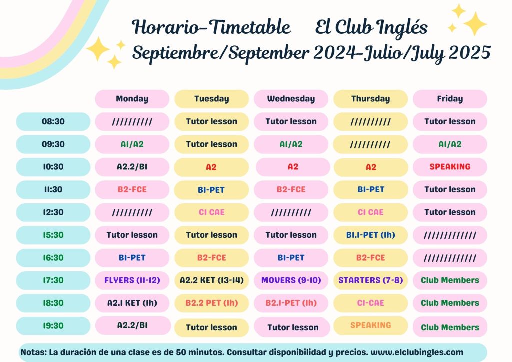 El nuevo curso académico empieza el lunes 2 de septiembre y dura hasta el 31 de julio 2025. Estamos trabajando en los horarios de las clases. Estará disponible tan pronto como nos sea posible. Mantente conectado. Cualquier consulta o sugerencia, no dudes en ponerte en contacto con nosotros.
